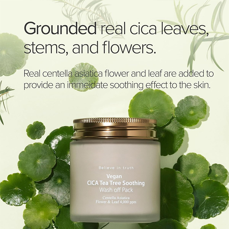 The “dual-phase repair” of CICA Tea Tree Soothing Wash off Mask – combining the strong adsorption power of mineral mud with the soothing power of centella asiatica and Australian tea tree essential oil in the same microcapsule: The mineral microcapsule absorbs oil and makeup residue in 10 minutes, simultaneously releasing asiaticoside and 4-terpene ol, immediately reducing redness and lowering temperature, and preventing sensitive skin from feeling tight and stinging.