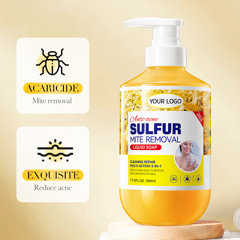 Sulfur mite removal liquid soap has rich and fine foam, which can deeply clean the skin, effectively control oil, remove acne, and make the skin tender, smooth and delicate.